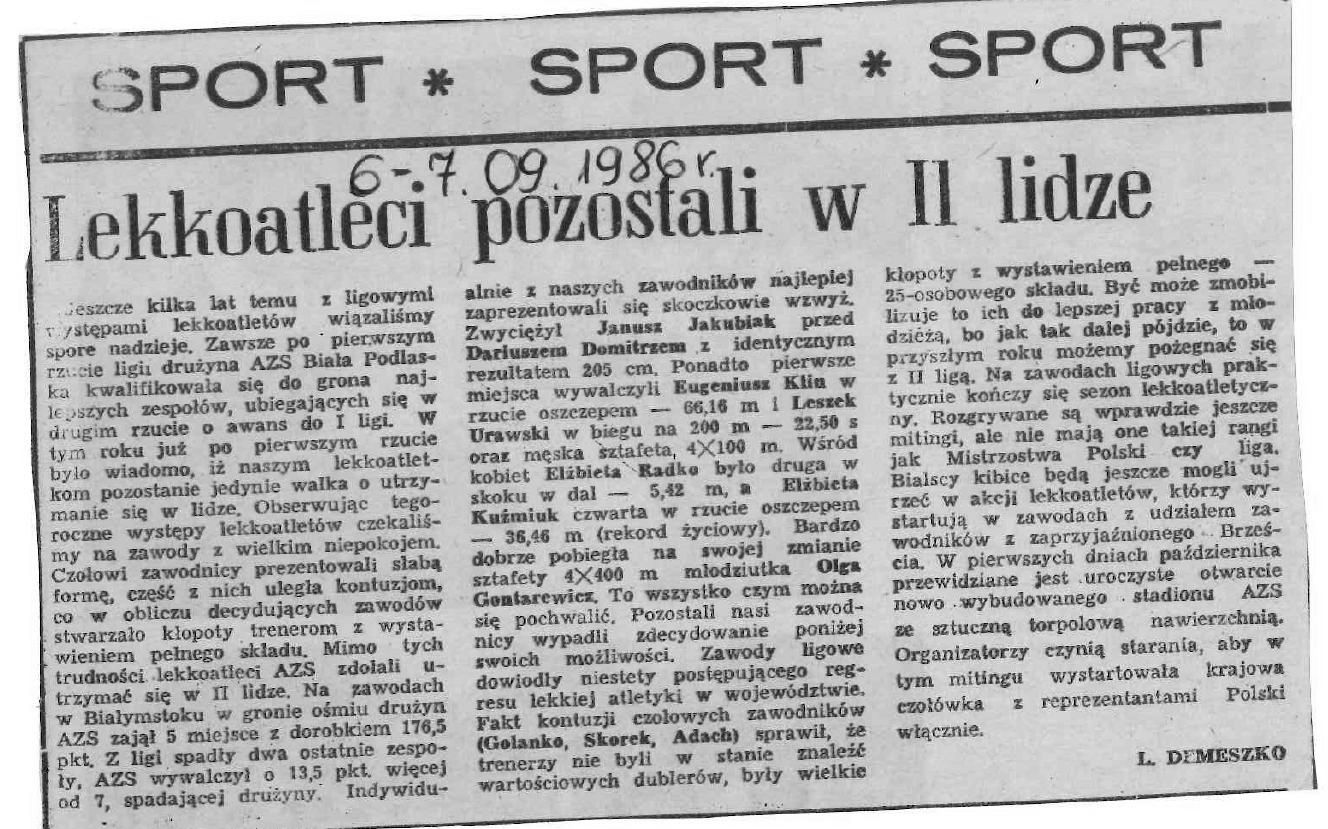 Rozgrywki ligowe rozegrane w dniach 6–7 września 1986 roku były dla bialskich lekkoatletów wymagającym sprawdzianem sportowym. Mimo problemów kadrowych i osłabionego składu, drużyna AZS Biała Podlaska zdołała utrzymać się w II lidze, a wśród zawodników i zawodniczek nie zabrakło występów, które zasłużyły na szczególne wyróżnienie.